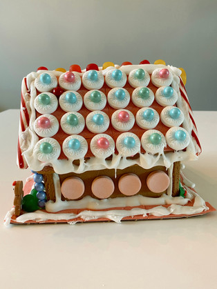 You want to know the secret for easy candy adhesion? 3 words...a glue gun. I glued all of the candy on the house and then used the royal icing to fill in the empty spaces to make it look like snow.